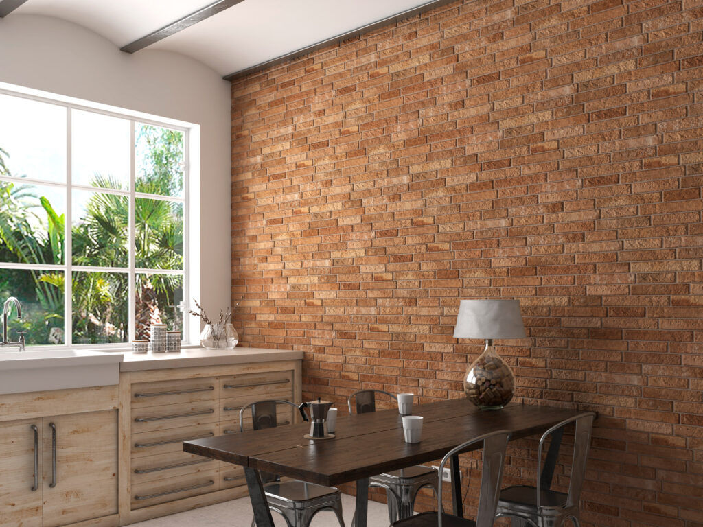 Baldosa de Gres Porcelánico para revestimiento. Medida de 17×52 de textura Mate con relieve adoquinado. Belleza y versatilidad en esta colección inspirada en los muros adoquinados creando atractivas paredes decorativas para paredes y fachadas.