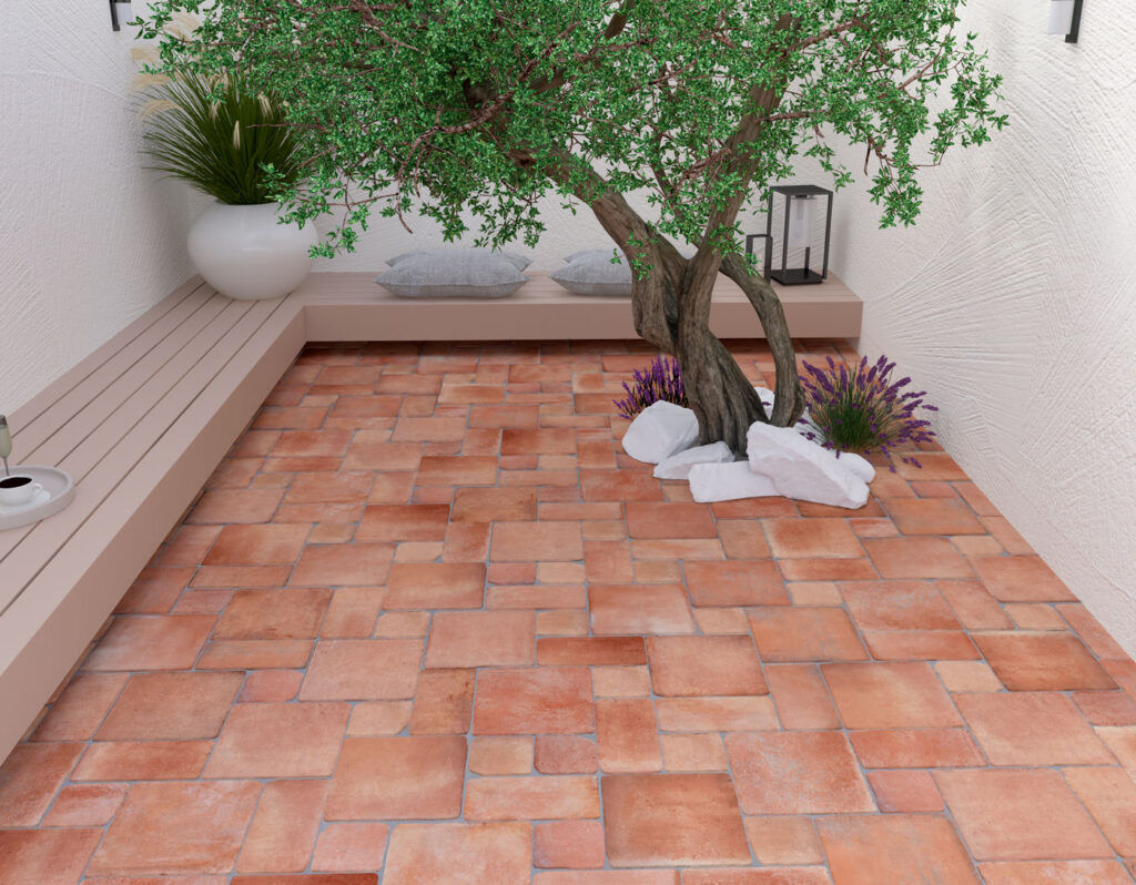 Las losetas de formas irregulares simularán el aspecto rústico y orgánico de las piedras naturales dispuestas de manera artesanal como si el material hubiera sido erosionado por el tiempo.