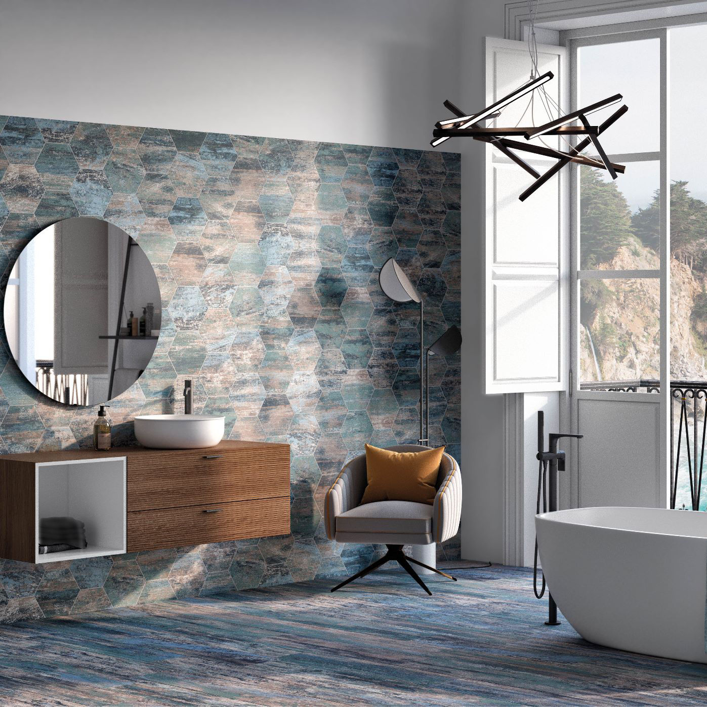 Baldosa de Gres Porcelánico de Pasta Blanca para pavimento. Medida de 25×22 Hexagonal de acabado Mate. Maderas de colores atrevidos y que personalizan cada uno de tus ambientes a decorar.