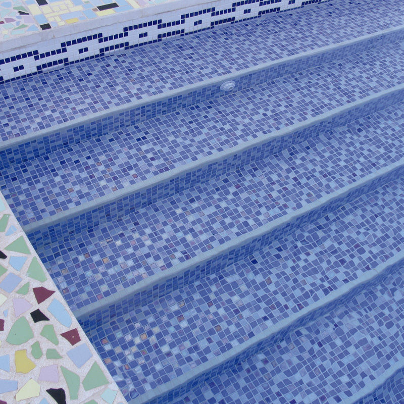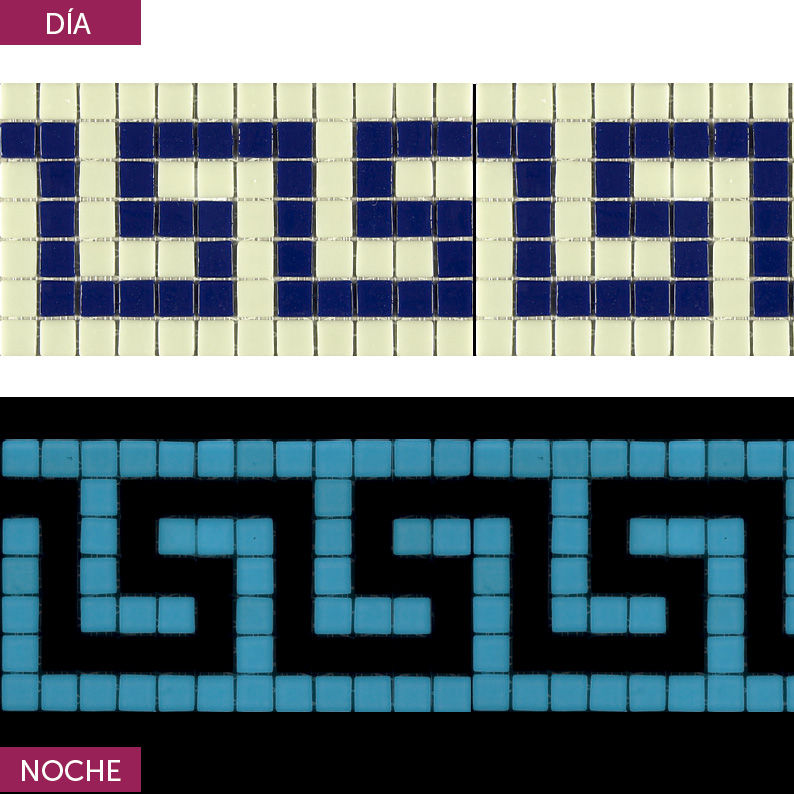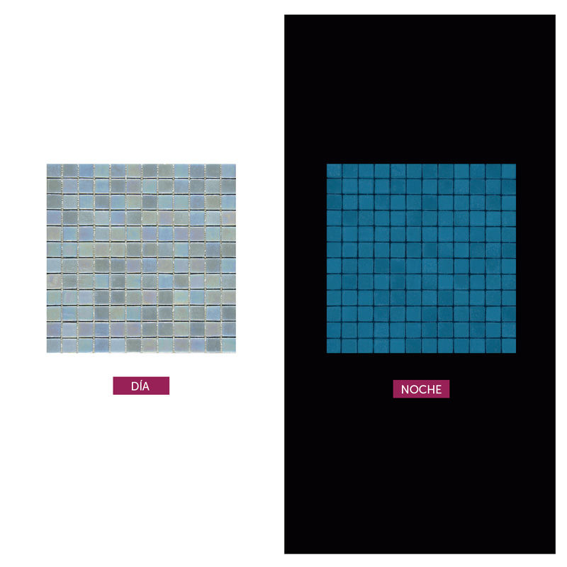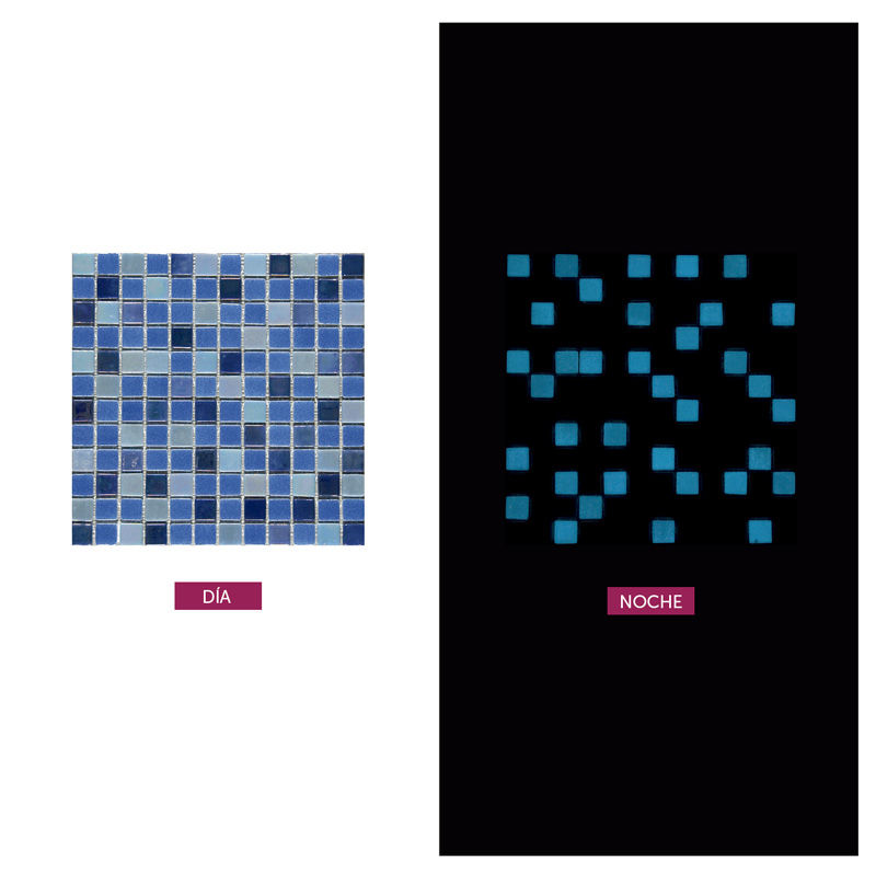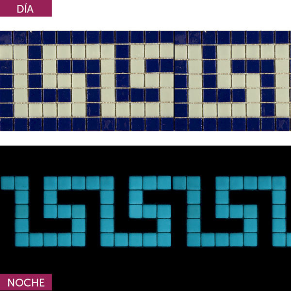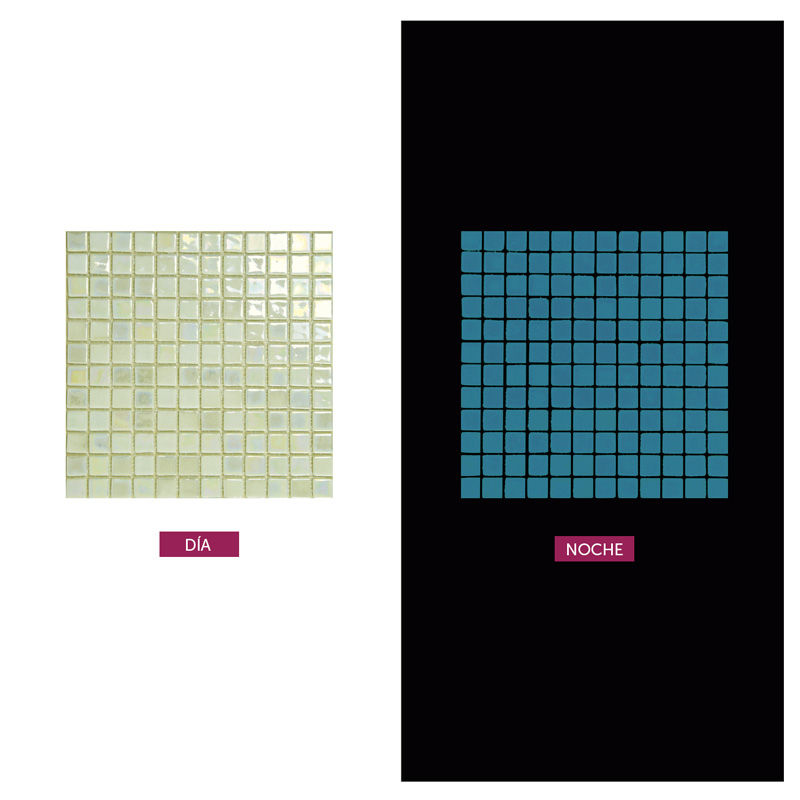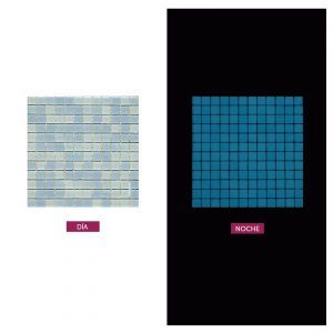 Azulejo de Mosaico Vítreo para pavimento. Medida 2,5×2,5 enmallado en 31,6×31,6 de acabado en Brillo. Cuando queda en la oscuridad (después de haber estado iluminado) emitirá una suave luz que será visible en la oscuridad. El tiempo que dura la emisión de luz depende del modelo, del tipo de luz utilizada, y del tiempo de iluminación, variando de intensidad en el tiempo. Para aumentar en tiempo e intensidad, será necesario iluminarlo con luz negra, permaneciendo la fosforescencia todo el tiempo.